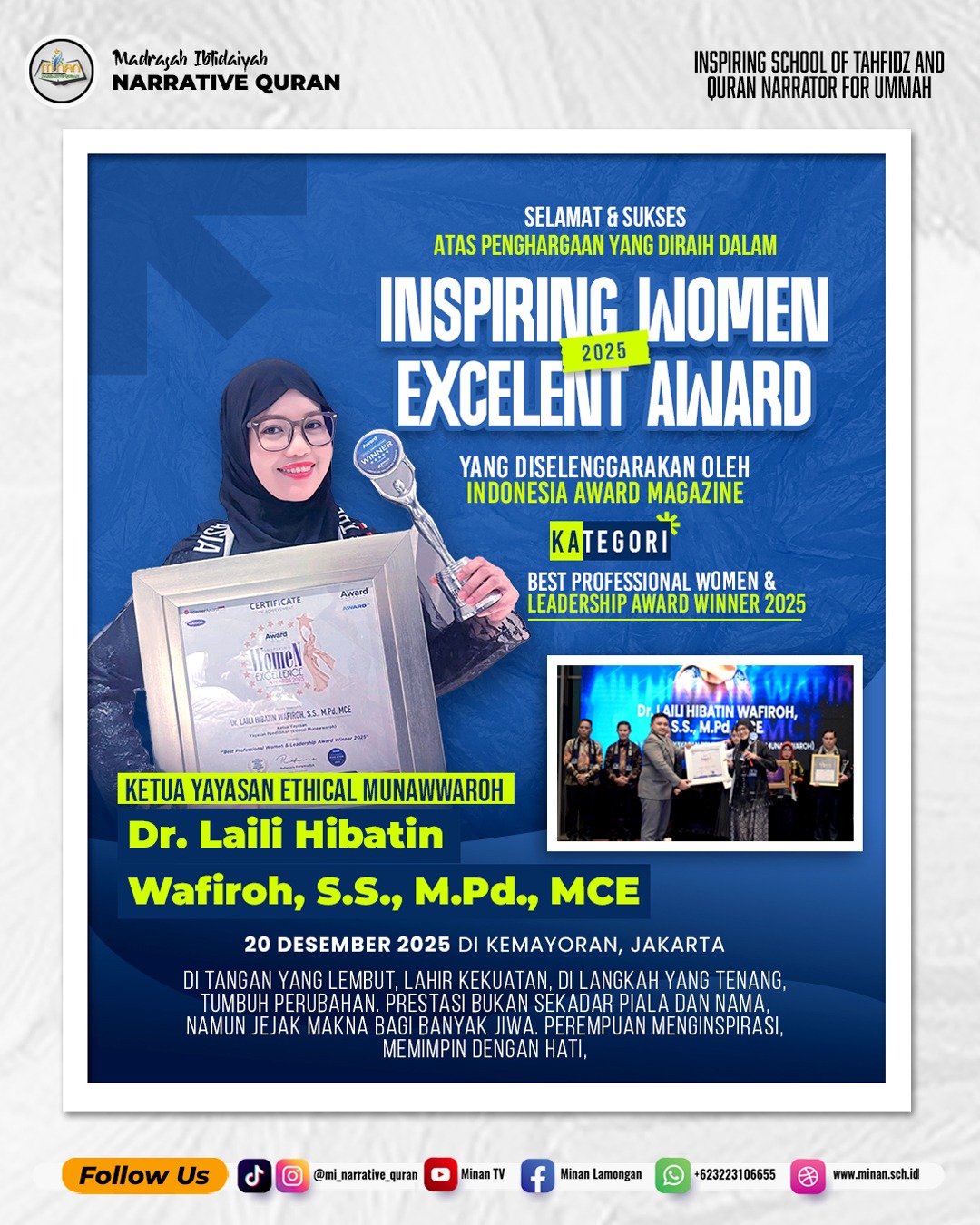 Jakarta – Prestasi membanggakan kembali diraih oleh keluarga besar MI Narrative Quran. Ketua Yayasan Ethical Munawwaroh, Dr. Laili Hibatin Wafiroh, S.S., M.Pd., MCE, berhasil meraih Inspiring Women Excellent Award 2025 yang diselenggarakan oleh Indonesia Award Magazine.