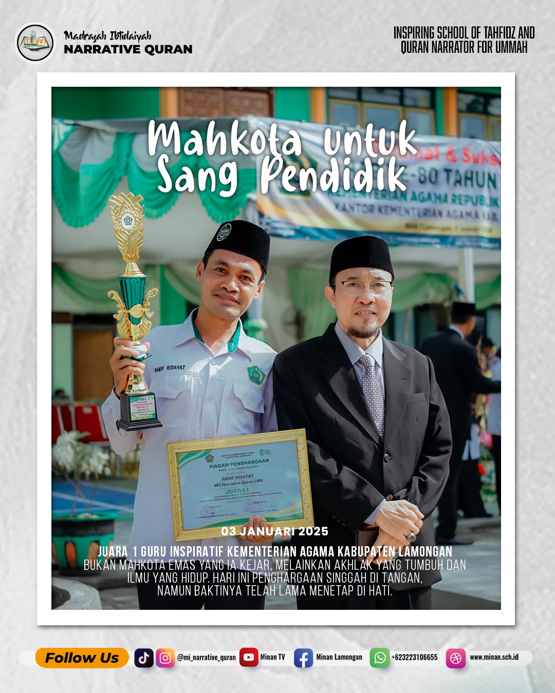 Penghargaan tersebut dianugerahkan oleh Kantor Kementerian Agama Kabupaten Lamongan dalam rangka Hari Amal Bhakti Kementerian Agama RI ke-80, dan diserahkan langsung oleh Kepala Kantor Kemenag Kab. Lamongan Bapak Dr. H. Mohammad Muhlisin Mufa, S.Ag., M.Pd.I. berupa trophy dan piagam resmi pada tanggal 3 Januari 2026. Momentum penyerahan menjadi simbol pengakuan atas dedikasi panjang seorang pendidik yang menanamkan nilai, bukan sekadar mentransfer ilmu.